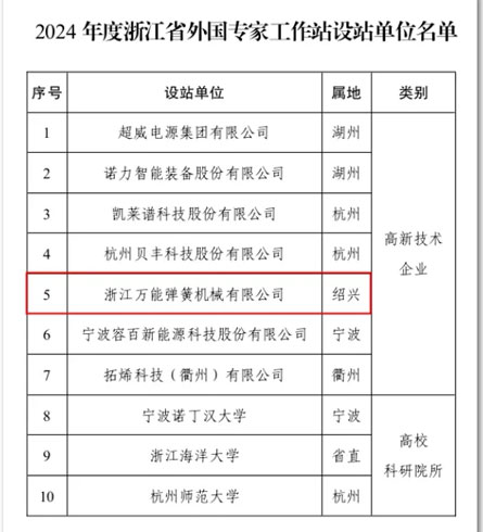 在全球化與科技創(chuàng)新的驅(qū)動(dòng)下,浙江省外國(guó)專(zhuān)家工作站成為吸引國(guó)際高端人才、推動(dòng)企業(yè)創(chuàng)新發(fā)展的重要平臺(tái)。自2020年《浙江省外國(guó)專(zhuān)家工作站管理辦法》實(shí)施以來(lái),紹興市在吸引外籍專(zhuān)家方面取得了顯著成績(jī)。截至目前,紹興市已有6家單位獲批為省級(jí)外國(guó)專(zhuān)家工作站,位居全省前列。 2024年,浙江萬(wàn)能彈簧機(jī)械有限公司榮...